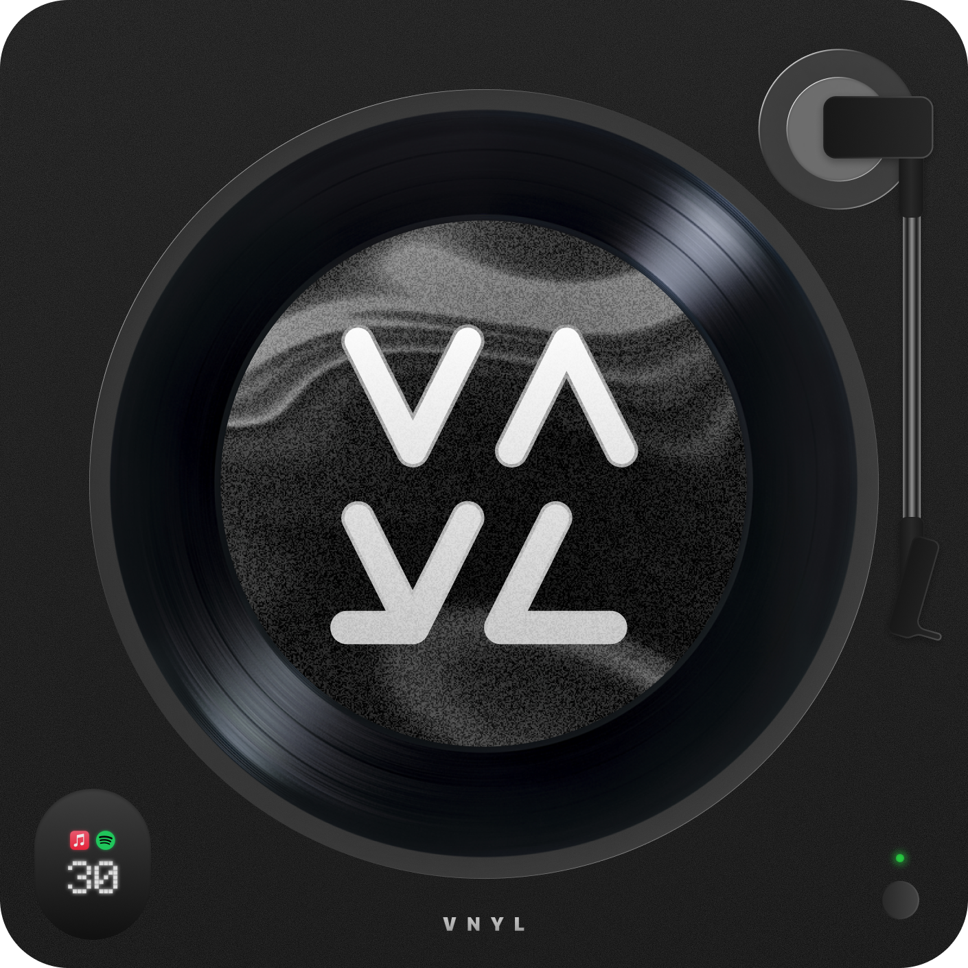 Yes, VNYL works alongside your existing music subscription. It reads what’s currently playing and displays the album art on a spinning vinyl in your dock. You’ll need either Apple Music or Spotify to provide the music.